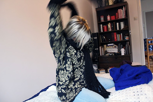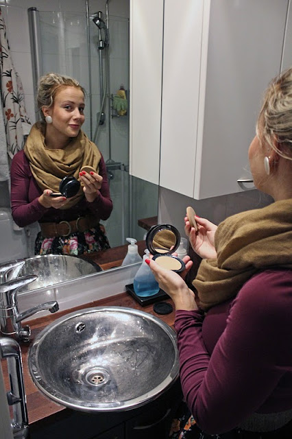 Tänäänkin turvauduin päähuiviin, joskin tuollaiseen 90-luvun lapsuuden jäännökseen. Korvissa roikkui puiset retrohelyt ja päällä roikkui oksennuksenvihreä H&M:n miestenosastolta hankittu, sunnuntaille juuri sopiva rötkäle. Maiharit ja perussiniset farkut sopivat lyhyenläntiin jalkoihini ja kaiken päälle viskasin ruskean huivin ja Jannen Fjällräven-kirpputorilöydän, elikkä hailakanvihreän takin.