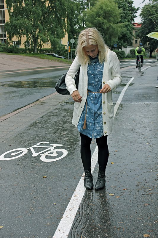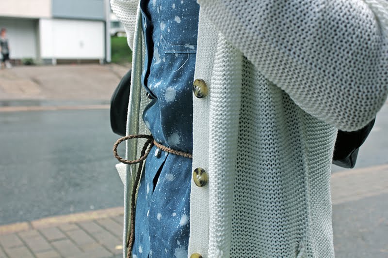 Anttilan löyhästi neulottu valkoinen takki pelitti hyvin Taiwanista mukaan matkustaneen ”maalitahraisen” mekon kaverina. Ohutta farkkukangasta oleva mekko on mukava päällä, mutta ilman vyötä aika laatikko. Siksipä turvauduin taas kerran ”narunpätkään”: Vyötin ohuella, punotulla nuoralla mekon vyötärön tiukalle. Sataa sataa ja vesipommit sulautuvat hyvin mekkoni tahroihin.