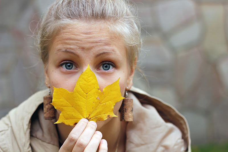 Himoitsin kaikki yhteiset hetkemme siskoni villapaitaa, Ruotsin tuliaista. Ehkä lehtien värillä olikin se tarkoitus, että punainen paita pääsi paremmin esille niitä vasten. Roosaliina taas hamusi viinipullonkorkki-korviksiani. Ehkäpä askartelen sellaiset hänellekkin hamassa tulevaisuudessa.