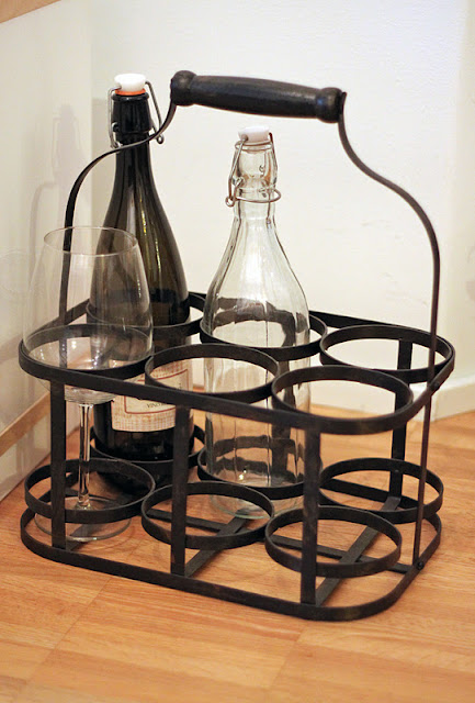| Metallinen pullokori, joka tuotiin Jannen kanssa häämatkalta tuliaiseksi. Kirpputorilta on löytynyt jo kaksi vanhaa pulloa täytteeksi. |