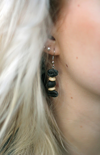 Etiopiasta raahamani kahvipapu-korvikset löytyivät korurasian uumenista ja otin ne taas käyttööni. Yritän uskotella itselleni, että ne tuoksuvat vielä kahville. Todellisuudessa tuoksu on vain vähän ummehtunut. Kahvi-ummehtuneisuus? Aika sama.