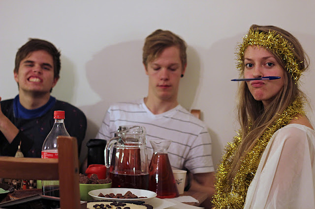 Oli ruokaa ja oli kivaa populaa. Kolmea kakkua, pipareita, mokkapaloja, kiloittan suklaata ja karkkia, glögiä, punaviiniä, sipsiä, suklaabanaaneja, limukkaa ja iso läjä mandariineja. Joulufiilistelyä ja yleistä kuhinaa: melutaso oli mukava ja tunnelman taso myöskin.