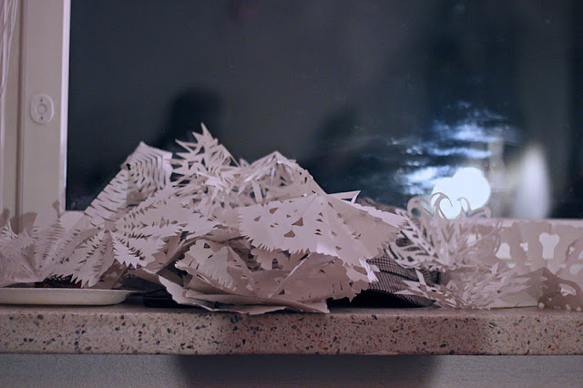 Janne piti vierahille illan aikana pitkät kalsarit -aiheisen tietovisan. Kukapa tiesi entuudestaan, että Etelä-Korean pressa on julistanut käyttävänsä pitkiä kalsareita sähkön säästämiseksi? Ja niin kuin kunnon joulukesteillä, niin myös meillä askarreltiin. Haastoimme porukan vääntämään kukin omalla taidoillaan alakoulu-opetuksen siivittäminä lumihiutaleita meidän olkkarin ikkunaan. Imuroimista riittää vielä ensi viikoksi, mutta niin myös ikkunakoristeita. Kiitos kaikille kauniista ja ei niin kauniista (Ville..) hiutaleista.