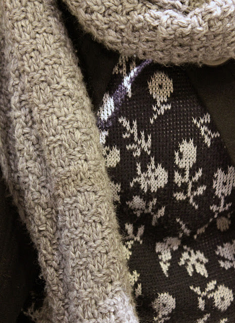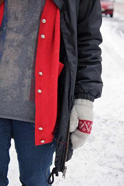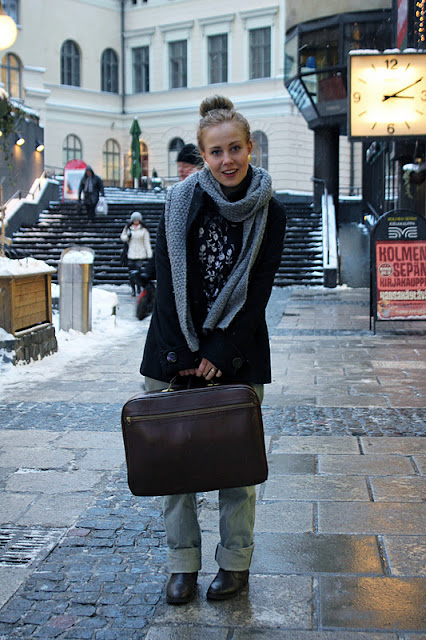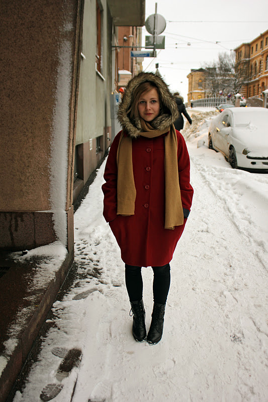 Olen iloinnut suuresti takkiuutuudestani. Se on ollut lämmin ja sopivan pitkä. Kaikki huivit tuntuvat sopivan ja mustien villakangastakkien sijaan tämä on luonut päivääni riemua pelkällä värillään. Huppuhuivini on myös ollut oiva kaverini nyt pimeinä ja kylminä aikoina. Lumisateen pyryttäessä pääsen aina turvaan huivini suojiin. Takin alle voi rakennella vaikka minkämoisia kerroksia: Tällä kertaa mentiin merimies-meiningeissä, kun Porin kirpputorilta löytynyt raitapaita sai ensiesiintymisensä sinisen villatakin kanssa.