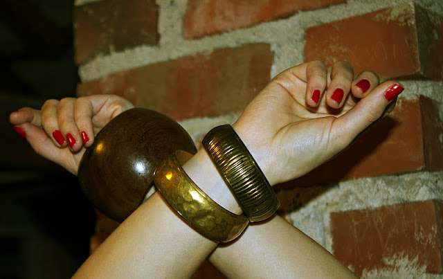 Pidän massiivisista koruista. Ranteitani painoivatkin isot käsirenkaat: vasenta suuri ja puinen ja oikeaa kaksi metallista. Kirjoittaminen ja dataaminen on tosin hankalampaa, kun ranteissa kolisee. Tuleepa ehk nördäiltyä vähemmän. Pidän tästä asusta. Pienellä fiksaamisella sen saa muokattua arkeen ja juhlaan. Kuulun muutenkin niihin ihmisiin, jotka eivät tahtoisi erotella juhla- ja arkivaatteitaan. Sain juuri Jannelta nimipäivälahjaksi toissapäivänä nahkamekon ja se on täydellinen esimerkki siitä, kuinka asusteilla ja meikillä voi muokata asun kekkereille ja koulupäiviin.