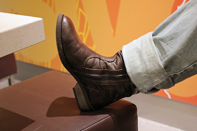 | Mutta niin kuin huomaatte, kiinnostusta löytyy enemmän jätskisösseröille. Nostin kuitenkin nätisti jalkani tuolille, jotta kuvaaja pystyy ikuistamaan kenkäni. |