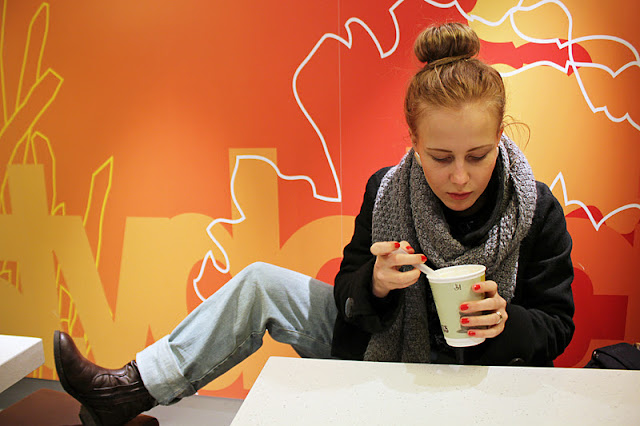 | Tällä kertaa nautiskelin jätskiäni ruskeissa kengissäni, jotka nyt lumen tullen otin käyttööni! Nämä olivat oikea löytö, kun kiertelin Dinskon lastenosastoa joskus syksymmällä. |