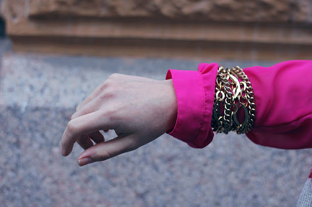 Tiedättekö, vaikka kuinka esittelen täällä ”päivän asujani”, niin suht usein on sellanen olo, että ”mitähän ihmettä”. Usein, kun katsoo jälkeenpäin kuvia huomaa, ettei kaikki nyt mennytkään ihan putkeen. Niin kuin vaikka ylläolevien vaatteiden kanssa: Olin hienosti valikoinut pinkin ohuen paidan ja sen kaveriksi ison kasan kultakoruja. Toimii, mielestäni. Mustat kengät, takki ja housut, jotta pinkki ja kulta pääsee esille. Mutta sitten.. Tuliko kiire, vai pettikö tyylitaju? Mikä on tuo kirjavan sinertävä huivi? Pinkki alkaa näyttää halvalta, kuin myös kultakorut (toisaalta, halpojahan nämä olivatkin.. mutta että vielä näyttävät siltä). Täytynee myöntää epäonnistuminen. Ei totaalinen, onhan tuossa nyt jotain järkeä. Ehkä. Vaatteet ovat onneksi ’maailman vakavimmat ja tärkeimmät asiat’ -listalla ehkä sadanviidensadan jälkeen.