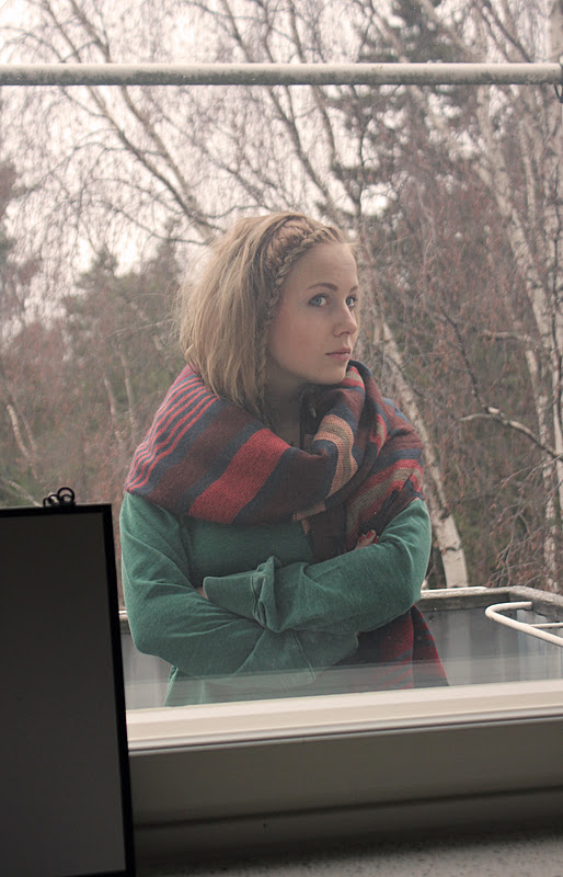 Olkapäille heitin paksuraitaisen huivin. Tässä huivi, joka on kerrankin tarpeeksi muhkea. En käsitä, miksi tähän maahan on tehtävä miljoonittain lyhyitä ja kapeita huiveja ja sitten vain muutaman mukavan suuri ja pehmeä. Kiitos Hennalle, joka jaksoi tämän minulle kaupasta kiikuttaa. Pus! Korvissa killuivat Hannan tekeleet, ihanat sulkakorvikset. Hauska yhteensattuma oli, kun viimeksi fiilailin intiaanijuttuja täällä blogissani, niin Roosa vinkkaili, että tilaappa Hannan blogista hienot korvikset. Kappas kappas, ajatuksemme kulkee samaa rataa, sillä olin jo ehtinyt tilata niitä muutama viikko sitten. Kahdet.