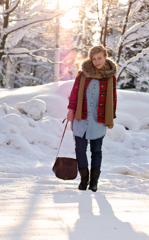 Tänä kauniina päivänä kuljin jouluaatto-kuvista tutussa skottipaidassa. Sen alle sujahti mukavasti pikkuhihainen farkkumekko, joka on yksi mukava syy odotella lämpöisiä kelejä hurmaavan talven keskellä. Ja jotenkin lähiviikot oon mennyt kultahumuissa, siksipä taas kultaista roikkui ihan kunnolla korvassa. Nämä JC:stä ostetut korvikset olivat lempparini tanssitunneilla, koska ne painavat niin vähän, mutta ovat kuitenkin näyttävät.