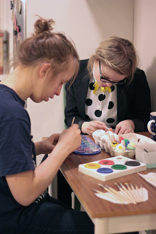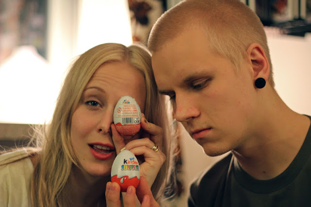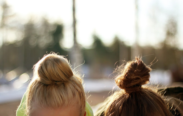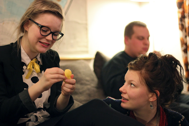Päädyin asuvalinnassani lyhyeen, pikkuhihaiseen nahkamekkoon, jonka etuosa on tekonahkaa ja takaosa pehmeää perus paitakangasta. Koruja roppakaupalla, bling bling! Hiusten kanssa olikin enemmän pohdittavaa: mikä on helpoin juhlava kampaus, jonka osaan vääntää? Ömmm nuttura? Ömmm ponnari? Ömm hiusten suoristus? Kiharakeesi! Hurraa. Foliot yöksi ja pinneillä ylös. Lopulta sain vielä perjantain aamupäivän koulutunneilla tuhannesti apua ihanalta Lauralta, hän jopa letitti sivuhiukseni. Roosaliinalle kehiteltiin sähkönsininen paljettimekko ja punainen kirjekuorilaukku. Ja arvatkaa mitä, ylitin itseni! Letitin hänen sivuhiuksensa. Nyt niitä ablodeja.