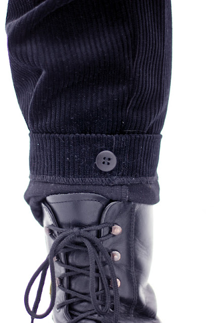 Oho, näyttääpi että sammarini kaipaisivat nukkarullaa! Joka tapauksessa housuvalintani oli korkeavyötäröiset sammarit, jotka ovat Uff:ilta löytyineistä aarteista. Vyötärö on mukavan napakka ja housut istuvat sopivan rennosti. Rentoutta lisätäkseni käärin lahkeet maihareitten päälle ja näin lahkeet jäivät pussille. Mutta tsekatkaahan tuota alempaa kuvaa, keksiikö kukaan mikä pointti on noilla napeilla sisälahkeissa? Epäilen, että ne ovat varanapit.. Mutta miksi ne olisi ommeltu lahkeisiin?