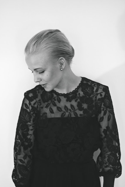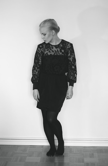 Tässä asussa näytän tädiltä. Kaikesta huolimatta pidän siitä: alanuttura, hiukset sliipattu taakse ja kaikki mustaa. Omistan vähän mustia vaatteita, vaikka pidänkin niistä. Omistan myös ainoastaan ihan pari hametta. Nyt yhdistin nämä kaksi mustaan bodyyn, jonka yläosa on väljää, kukkakuvioista pitsiä. Pitsikuvio näyttää hyvältä paljasta ihoa vasten, muttei paljastelua vasten. Käsivarret ja dekoltee riittävät oikein hyvin. Alle hihaton toppi ja jalkoihin mustat sukkikset sekä lyhykäinen hame. Tätityyli on valmis.