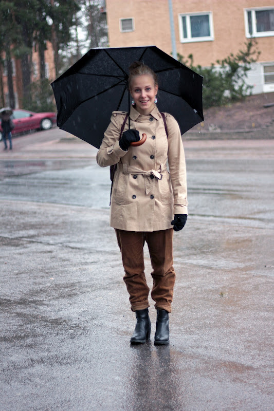 Perjantaina 20.4, eli eilen, oli kevään ensimmäinen trenssipäivä. Päätin sen torkkua painaessani, enkä alkanut puoltamaan päätöstäni sittenkään, kun avasin verhot: vettähän sieltä taivaalta iloisesti tulla tiputteli! Beige trenssi vaan niskaan, ja sateenvarjo sitä suojelemaan. Aina jaksan pohtia sitä, miksei sateenvarjoa ole vieläkään osattu kehittää sellaiseksi, ettei se kääntyisi tuulessa? Jo muinaisissa rakeisissa mustavalkokuvissa taistellaan sateenvarjojen kanssa. Kenen heiniä tämä kehittely on? Ryhdistäytykää!