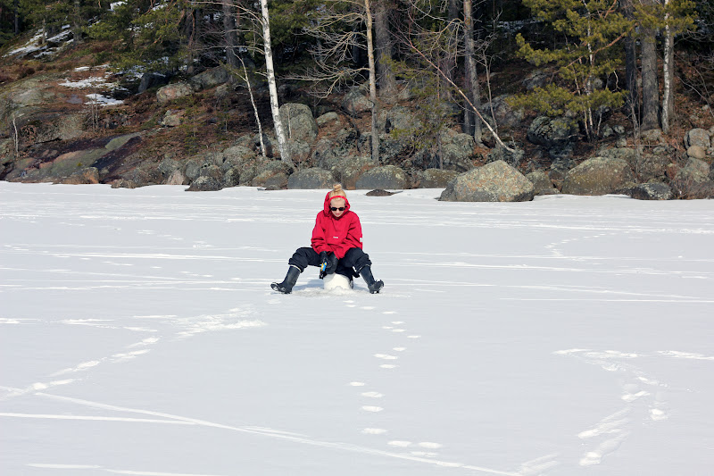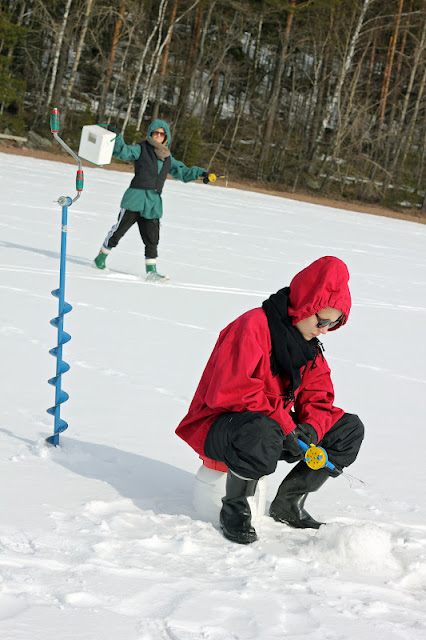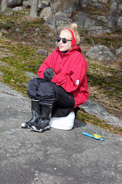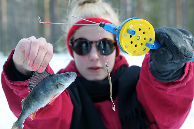 Puoltoista tuntia ja makkaratauko. Eikä yhtään kalaa. Nyt ei mennyt niin kuin elokuvissa. Jannella nykäisi muutaman kerran, mutta nekin taisi olla vain omia haavekuvitelmia. Voi toista. Aurinkolasit olivat kuitenkin coolit ja pilkkijakara mukava istua. 30 kairatun reiän ja vajaa kahden tunnin kököttämisen jälkeen tuli kilpailulle päätös. Ei kaloja. Mutta jotenkin mulla oli fiilis, että kun hetken vielä jaksan tönöttää, niin tälle kisalle tulee kunniallinen päätös: Ja kyllä! Nyki nyki nyki ja laitoin koukkuun herkullisimman madon. Muu perhe painui jo metsäpolulle kohti autoja, mutta minä nostin jään yläpuolella kelpo ahvenen!