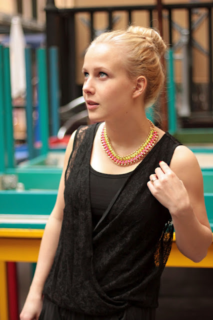 Minä niin ihastuin tuohon kaulakoruun ja nyt sitä on vilkkunut useammassakin blogissa. JA pitsiasia on siis haalari! Joskus sen VeroModan alerekistä ostin, kiitos kovasti.