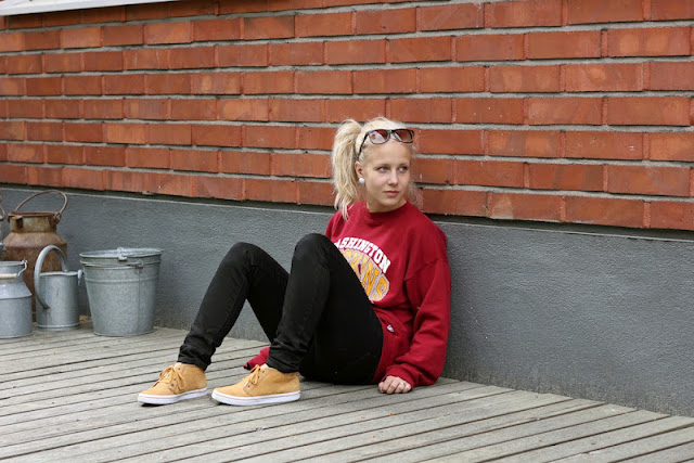 En tiedä mikä noissa pelipaidoissa viehättää. Ja alleviivattuna vanhoissa sellaisissa. Se nostaa käden ylös, joka tietää! Tämän viininpunaisen kanssa puin basic mustat Levikset ja jalkaani lainasin siskoni Adduja. Ovat muuten täydelliset kengät kaikessa tavallisuudessaan.