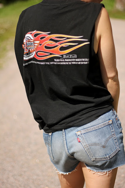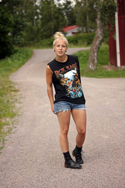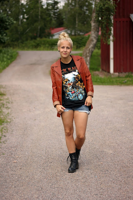 Leikkasin hihat veke, mutta kauluksen säästin. Mikä on näin jälkijärkevänä ollut ihan hyvä vaihtoehto, sillä noita minisortseja käyttäessä on jo muutoinkin riittävästi kinkkua tarjolla. Tukan heitin märkänä löysälle sotkunutturalle ja jalkaan maiharit. Maiharithan ne ovat tunnetusti ne parhaat kesäkengät.. NOT. Mutta rokkipaita+nahkatakki+purjehduskengät? rokkipaita+nahkatakki+balleriinat? Ehkä maiharit kuitenkin olivat ne oikein valinta.