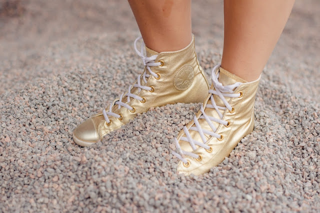Ja mitä olisi hip hop -tyyli ilman pipoa? Löysä, ruskea vakkarini sointuu sävyiltään leopardikuosiin ja on sopivan neutraali kaiken muun väritykityksen rinnalla. Lisää blingiä tuovat korvissa roikkuvat helyt, sekä jaloissa hohtavat kultaiset Conssit. Korvikset ostin Jyväskylä-aikoina erityisesti tanssitunteja ajatellet. Pomppiessa ja veivatessa korvisten on oltava riittävän simppelit ja eritoten kevyet. Nämä ovat juuri sellaiset.
