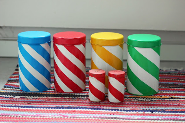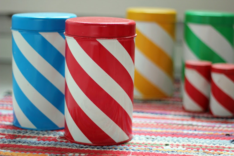 Totta kai! Anna mennä vaan. Isompiraitaiset ovat siis Aarikkaa, ohuempiraitaiset Marianne-karkkien vanhoja purkkeja.