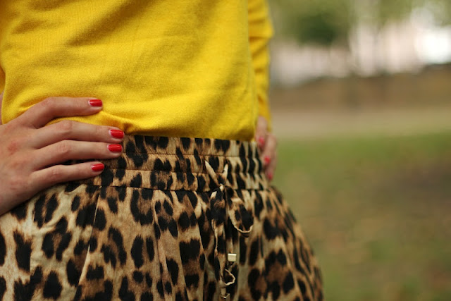leopardihousut/Zara, kengät/Vagabond, keltainen neule/Vero Moda, reppu/Fjällräven