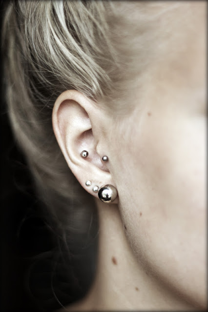 Tässä vihdoin viimein tulisi nyt sitten asiaa korvista (kuulen jo yleisön yököttelevän, hyihyi korvia). Mutta onneksi keskiössä ei oikesti ole korvat, vaan lävistykset. Naamalävistyksiähän minulla ei ole, mutta korviin on ripustettu muutamia ylimääräisiäkin helyjä. Miksi? Siksi että pidän korvalävistyksistä. Selkeistä rustoon lävistetyistä koruista, jotka ovat esteettisesti järjestetty, eikä korvia ole ahdettu täyteen summanmutikassa.