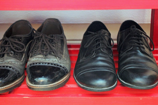 Tällä hetkellä omistan nämä kuvissa näkyvät yhdeksän paria aitonahkaisia, mustia kenkiä. Näiden lisäksi vintin kanahäkistä taitaa löytyä ainakin yhdet talvikengät, mummin vanhat. Jotenkin aina löydän itseni kaupan tai kirpputorin kassalta mustan kenkäparin kanssa. En usko, että nämä menevät koskaan pois muodista. Tai voiko nahka ylipäänsä joskus olla halveksittu, hyljeksitty materiaali? Etenkään tällaisina aikoina, kun ollaankin ymmärretty, että ne mummin vanhat nahkaiset talvisaappaat ovatkin ne kaikkein kestävimmät. Ja se upouusi, halpatuotannon tekonahkainen pari hajosikin sitten kolmannella käyttökerralla, eikä reklamaatioon ollut asiaa. Myyjä tokaisee, että ainahan kengät hajoavat nykyään muutaman kerran jälkeen.