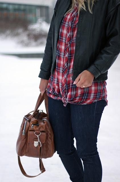 Tämä asu on pelkistetty. Olen yrittänyt loppuvuodesta löytää vaatekaappiini niitä tavallisia vaatteita, ja tässä ne yhdistyvät mutkitta: tummansiniset farkut, musta nahkatakki, punasini-ruutuinen flanellipaita. Asu on kaikessa kokonaisuudessaan suht simppeli. Se, mikä tekee sen viimeisen silauksen, ovat asusteet: ruskea laatikkomallinen nahkalaukku, sekä kipparinhattu. Kolmantena särmää ovat luomassa mustat nahkakengät. Ja yllätys yllätys, kaikki näistä kolmesta juontavat juurensa kirpputoreille: nahkalaukun ostin lukiovuosinani Kouvolan Fida-kirpputorilta, kengät ovat Helsingin Kaivarin Kanuunasta ja lakin ostin maanantaina Tukholmasta, Emmauksen Vintage-liikkeestä.