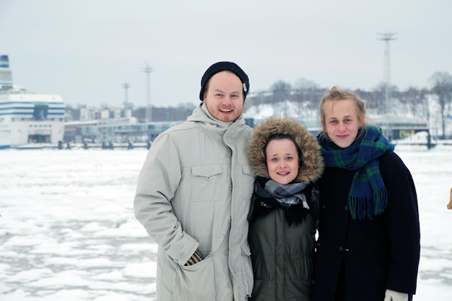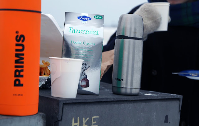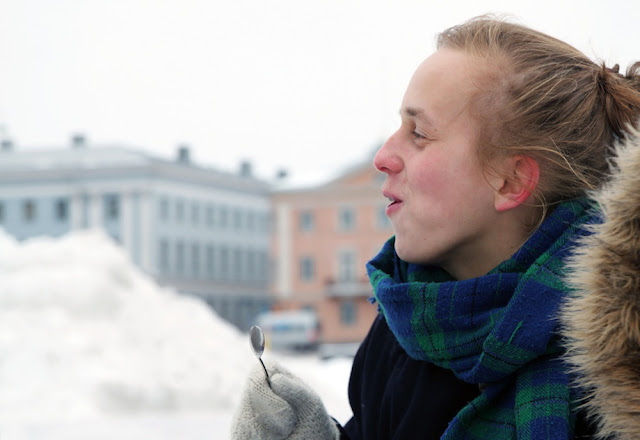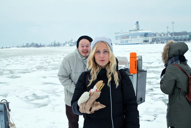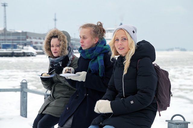 Ystävänpäivä-tunnelmia jakoon. Eilinen oli sattumalta täysin tyhjä kaikesta välttämättömästä ja joustamattomasta, joten päätimme pyyhältää Kauppatorin kulmille viettämään piknikkiä. Merituulen puhaltaessa ei ollut aivan sellainen perinteinen eväsretken tuntu, mutta mitä voisi helmikuulta odottaakaan. Minä, Janne, Tuomas ja Eeva uhmasimme lunta ja jäätä ja kannoimme termarit ja purtavat torille.
