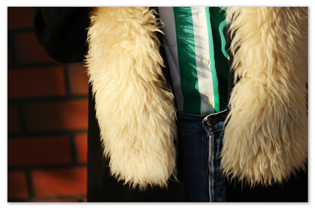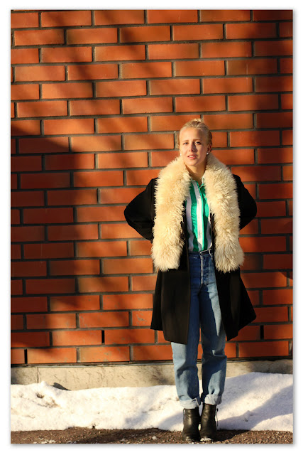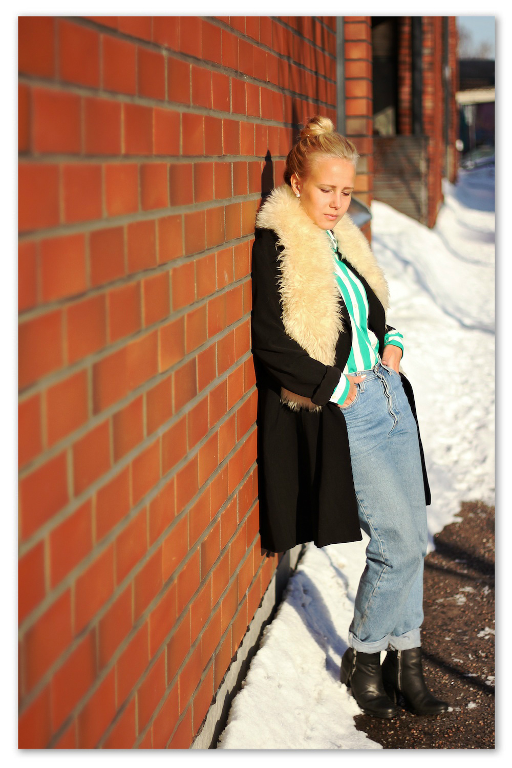 takki/Marimekko-second hand, farkut/Levi’s-second hand, kauluspaita/Burberry-second hand, turkiskaulus/second hand, kengät/Bianco footwear