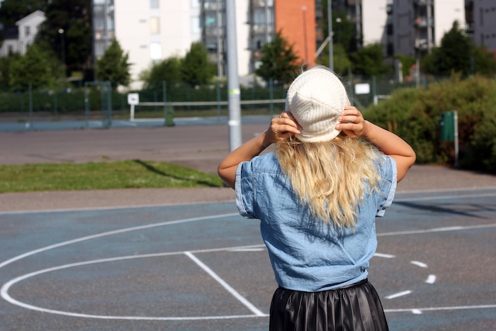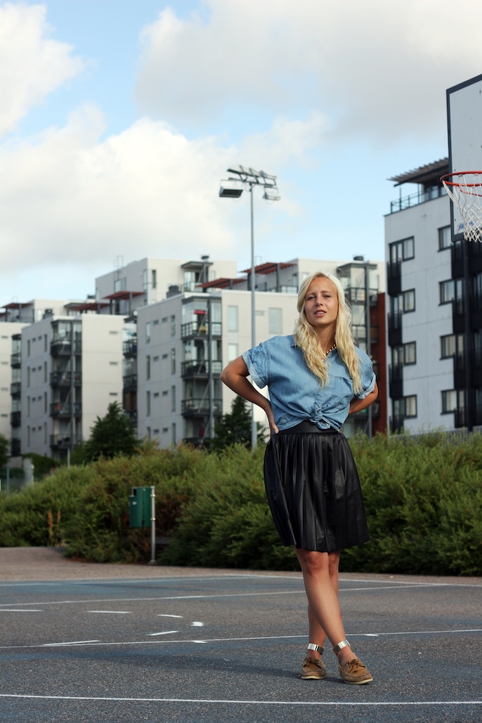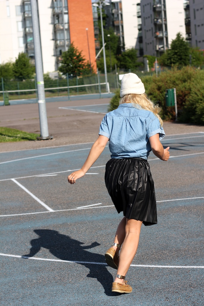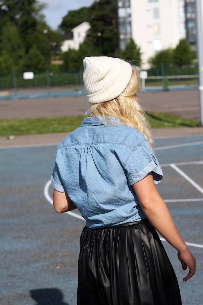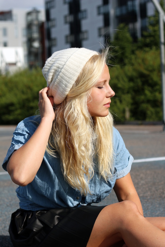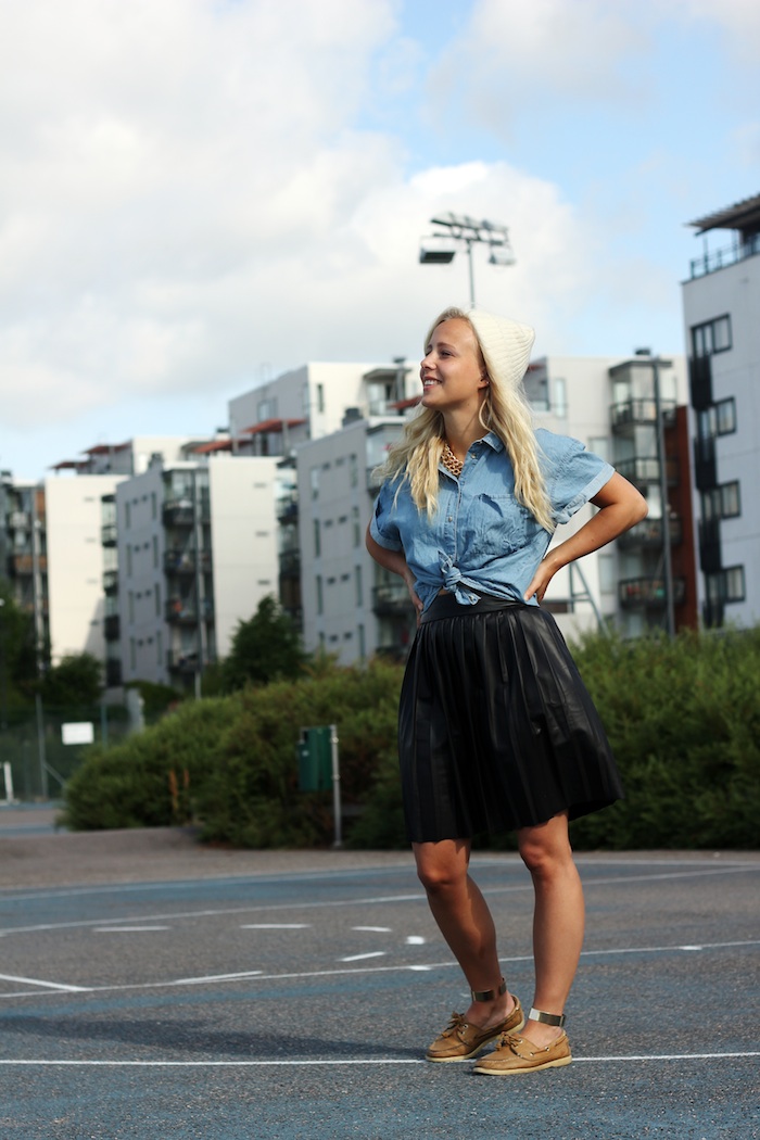 kengät, farkkupaita, hame, pipo, kaulakoru/second hand, nilkkarenkaat/H&M
