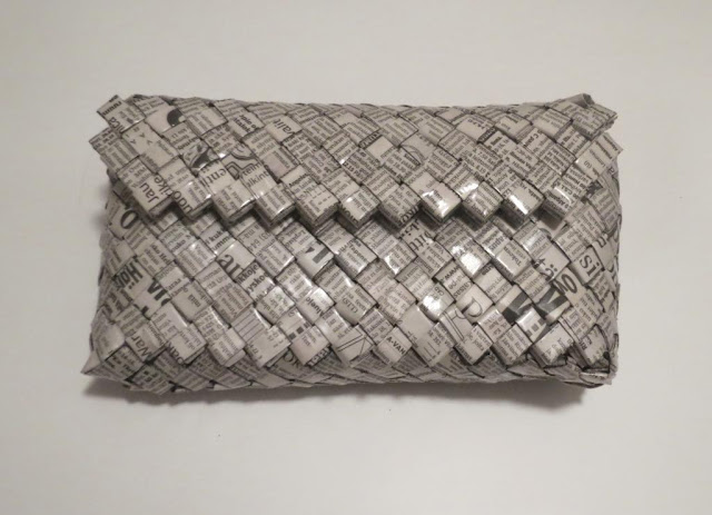 Tein itse asiassa jo pari vuotta sitten kesällä itselleni clutchin kontaktimuovilla päällystetystä sanomalehtipaperista ja jaoin silloin idean ja ohjeen omassa blogissani. Projekti on kauhean kiva, koska tarvikkeet ovat lähes ilmaiset eikä tekemisessä vaadita kuin kärsivällisyyttä ja vähän sorminäppäryyttä superkäsityötaitojen sijaan.