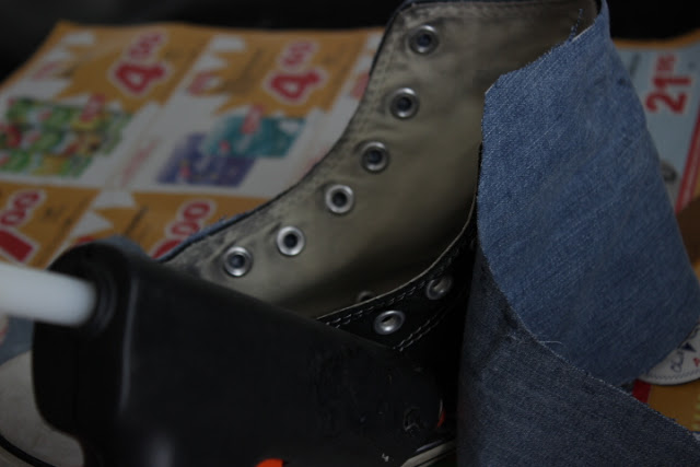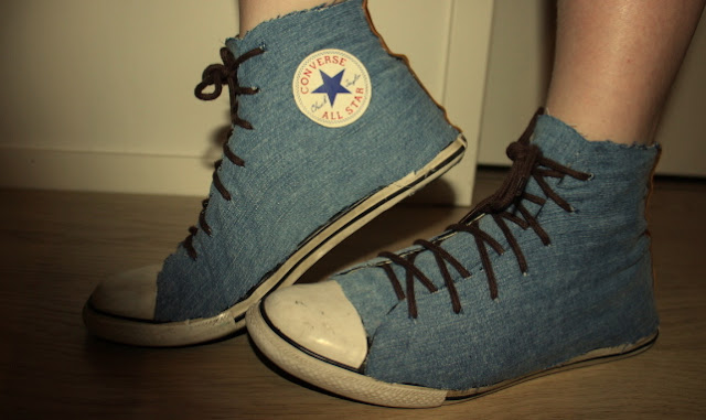 Käytin: nahkaa,farkkua,kuumaliimaa,saksia ja ostin uudet kengännauhat.