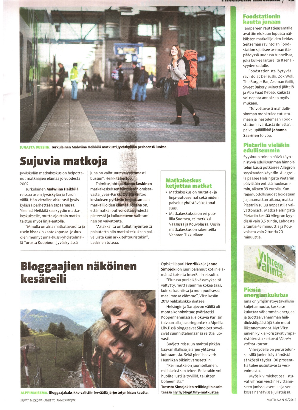 Mutta huomasinhan minä, ketä teillä on eniten ollut ikävä. Tietysti Jannea. Varmaan puolet kysymyksistä koski ”häntä ja meitä”. Senkin romantikot, vaalenpunaiset sydänleivokset. Kaipuuseenne kuitenkin vastataan rautatieasemilla, joissa on tarjolla VR:n omaa Matkaan-lehteä. VR oli tyytyväinen reiliblogiimme ja nostikin blogivinkkimme pieneksi uutiseksi lehteensä.