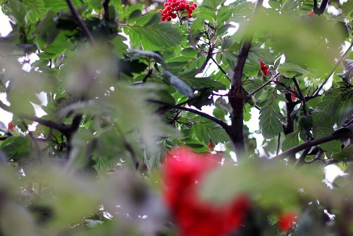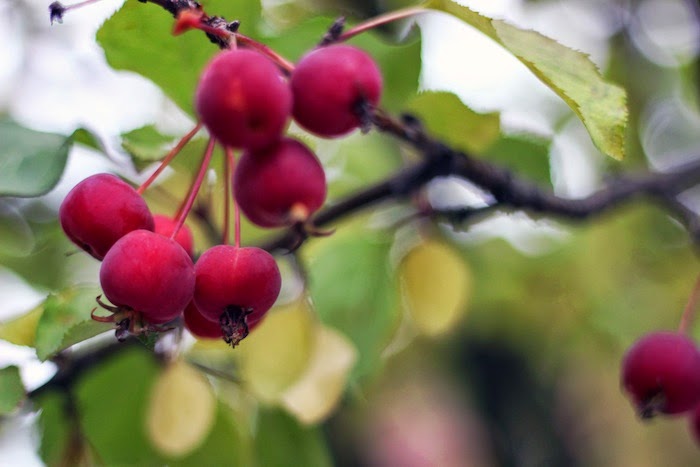 Olen ottanut kameran rullalle talteen kauniita syyskuun hetkiä muutamalta päivältä. On ollut Habitare design-messut, hiljalleen pimenevät illat, koulunalku ja loistoonsa puhjenneet omenapuut, pihlajanmarjat ja muut herkut. Muistan kuinka pienenä syksyn parhaita juttuja oli kiivetä veljien kanssa pihan isoon pihlajaan tiputtamaan marjoja äitille, joka keräsi marjat talteen ja teki hyytelöä. Lisäksi pyrähdettiin Joensuussa Jannen isovanhemmilla, syötiin puolukoita kilokaupalla, kahviteltiin taidekorttelissa ja mentiin moottoriveneellä saarelle mökkeilemään.
