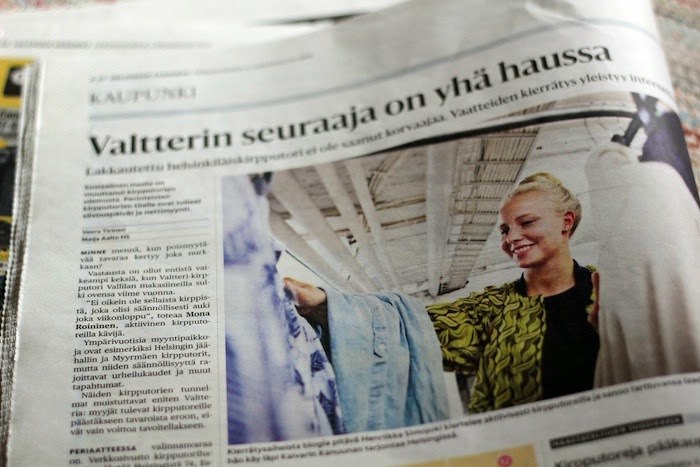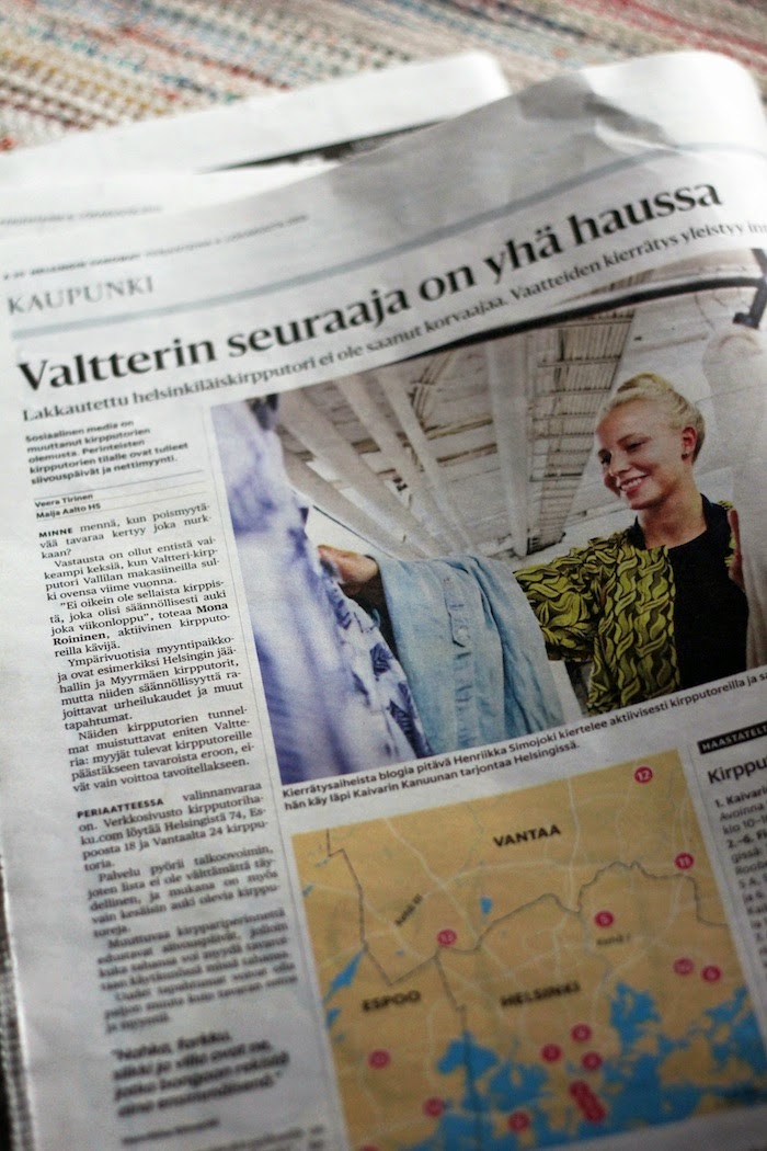 Voi teitä tarkkasilmäisiä, jotka pidätte silmänne auki maailmaa tarpoessanne. Olitte aivan oikeassa, minun naamahan se siellä päivän Helsingin Sanomien sivuilla nökötti. Viime viikolla Kaivarin Kanuunan kirpputorilla olin haastateltavana pääkaupunkiseudun kirpputoreista ja nykyisestä tilanteesta. Otsikko viittaa tietysti Vallilan makasiinien Valtterin kirpputorin sulkemiseen ja sen seuraamaan ”tyhjiöön”. Koko jutun pääkysymyksenä oli, minne kirppismyyjät ja -ostajat ovat siirtyneet Valtterin lopettamisen jälkeen?